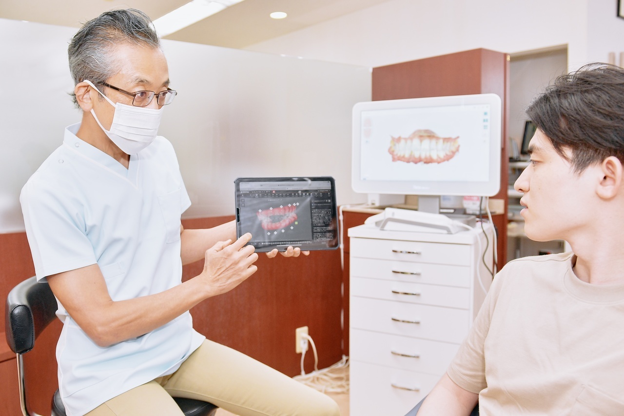 ワイヤー矯正、インビザラインともに大まかな説明を致します。インビザラインご希望の場合はiTero(アイテロ:お口の中をデジタルスキャンするカメラ)を使った3Dシミュレーションができます。複数の歯科医院で相談されてからご検討いただいても大丈夫です。