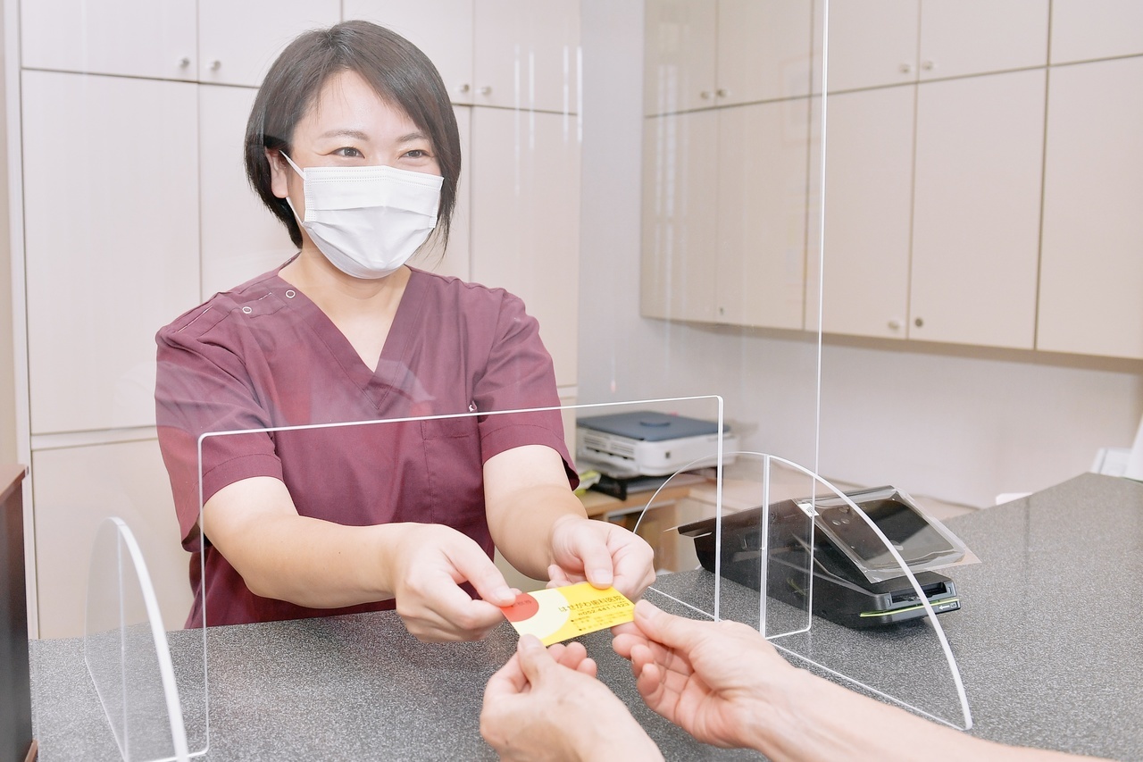 ご来院されましたら、受付で保険証と診察券(再診の場合)をお渡しください。初診の方には、問診票のご記入もお願いしております。